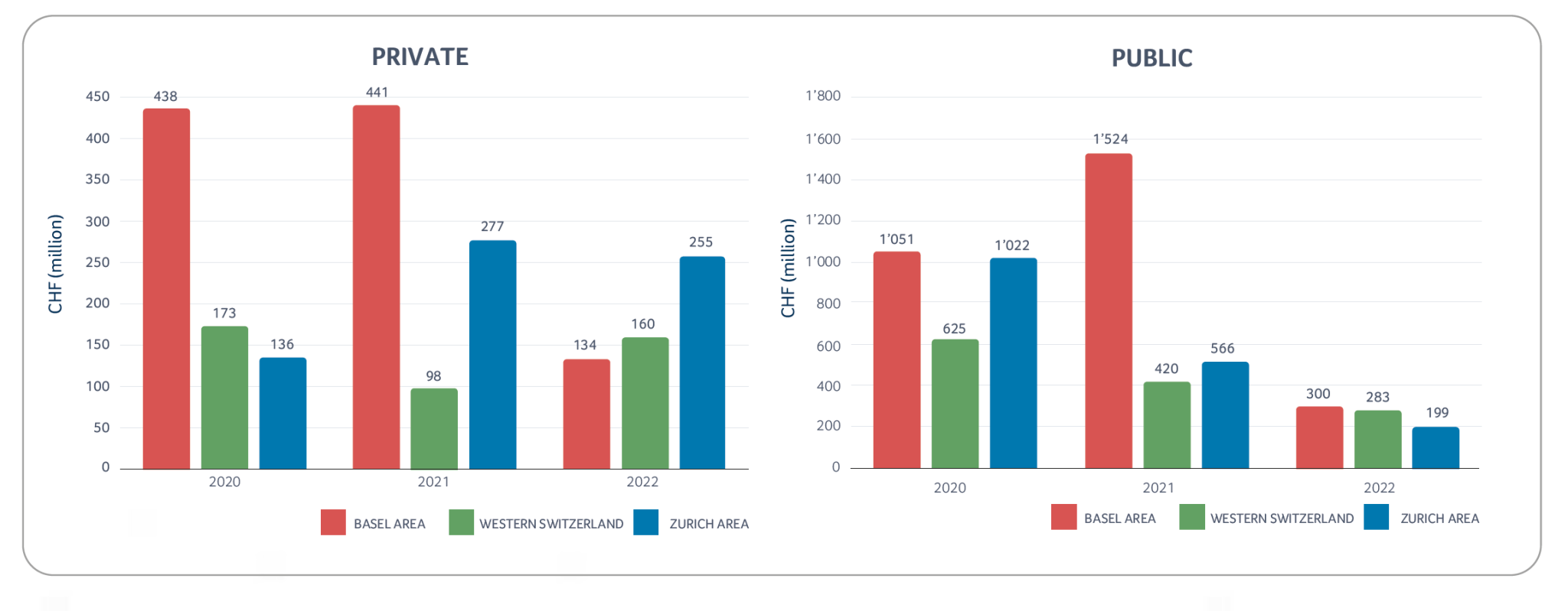 Despite the above-mentioned challenges, the Swiss biotech industry was able to raise more than CHF 1.3 billion in 2022, with roughly CHF 0.78 billion collected by public companies and the remaining CHF 0.55 billion collected by private companies. CDR Life with CHF 72 million raised, and ImmunOS Therapeutics with CHF 71 million raised, were the two largest private company financing transactions in 2022.