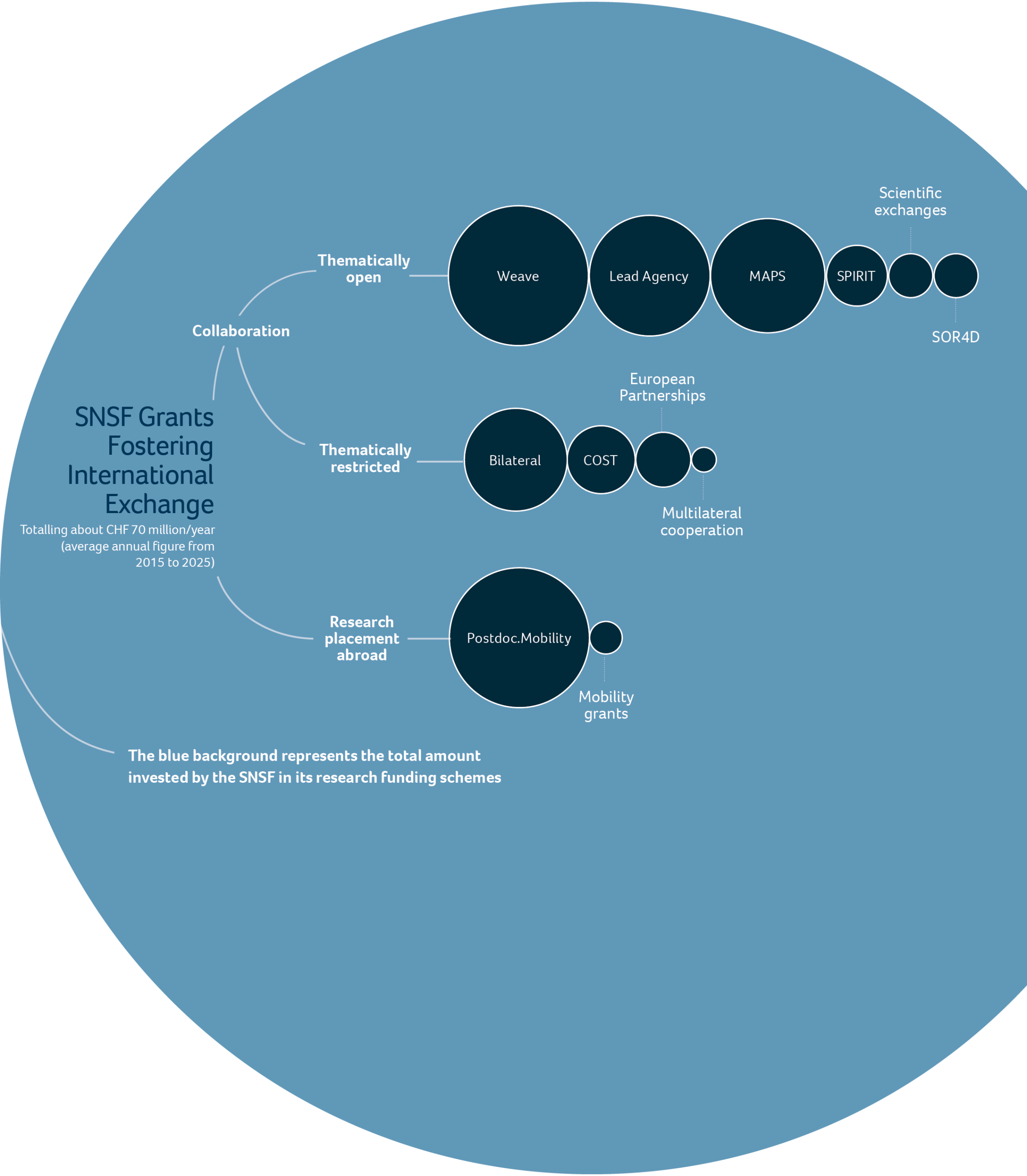 Overview of SNSF Grants Fostering International Exchange: Totalling about CHF 70 million/year (average annual figure from 2015 to 2025)