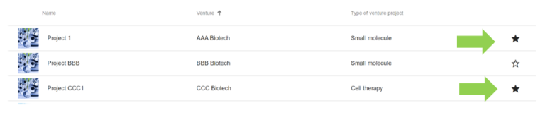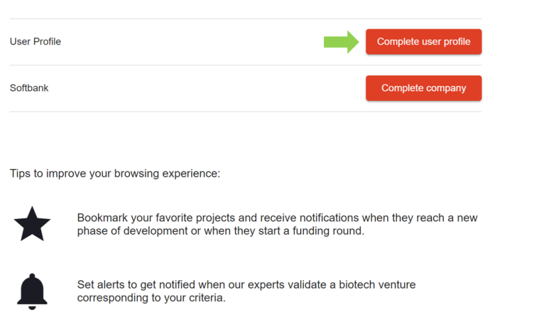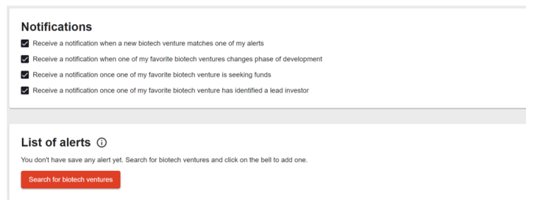 Searching for biotechs and creating new alerts is possible by clicking on the red “Search for biotech ventures” button.