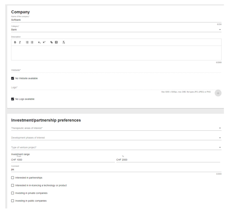 Now you can enter information about your company’s interests. Investors as well as pharma ventures will provide input on the typical investments size and their interest on the stage of development of the biotech companies, specific indications and modalities/type of business.