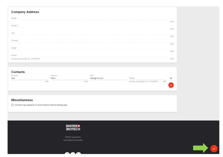 You have now entered all information. A member of the Swiss Biotech Association will confirm that you are eligible to use the Swiss Biotech Ventures platform, and you will receive an email once your profile is validated.
